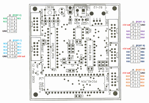 The following layout demonstrates where all the components are situated on the PCB and also indicates the Pin layout for each PORT.